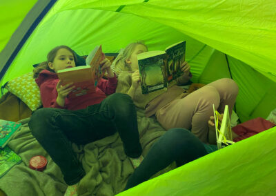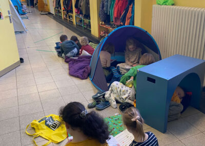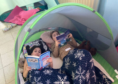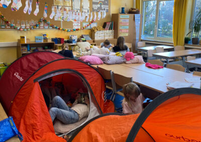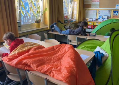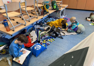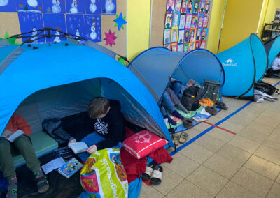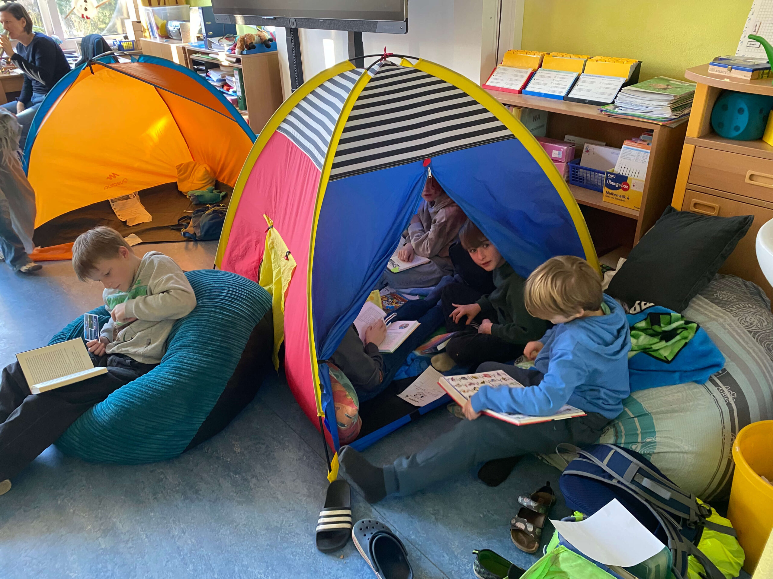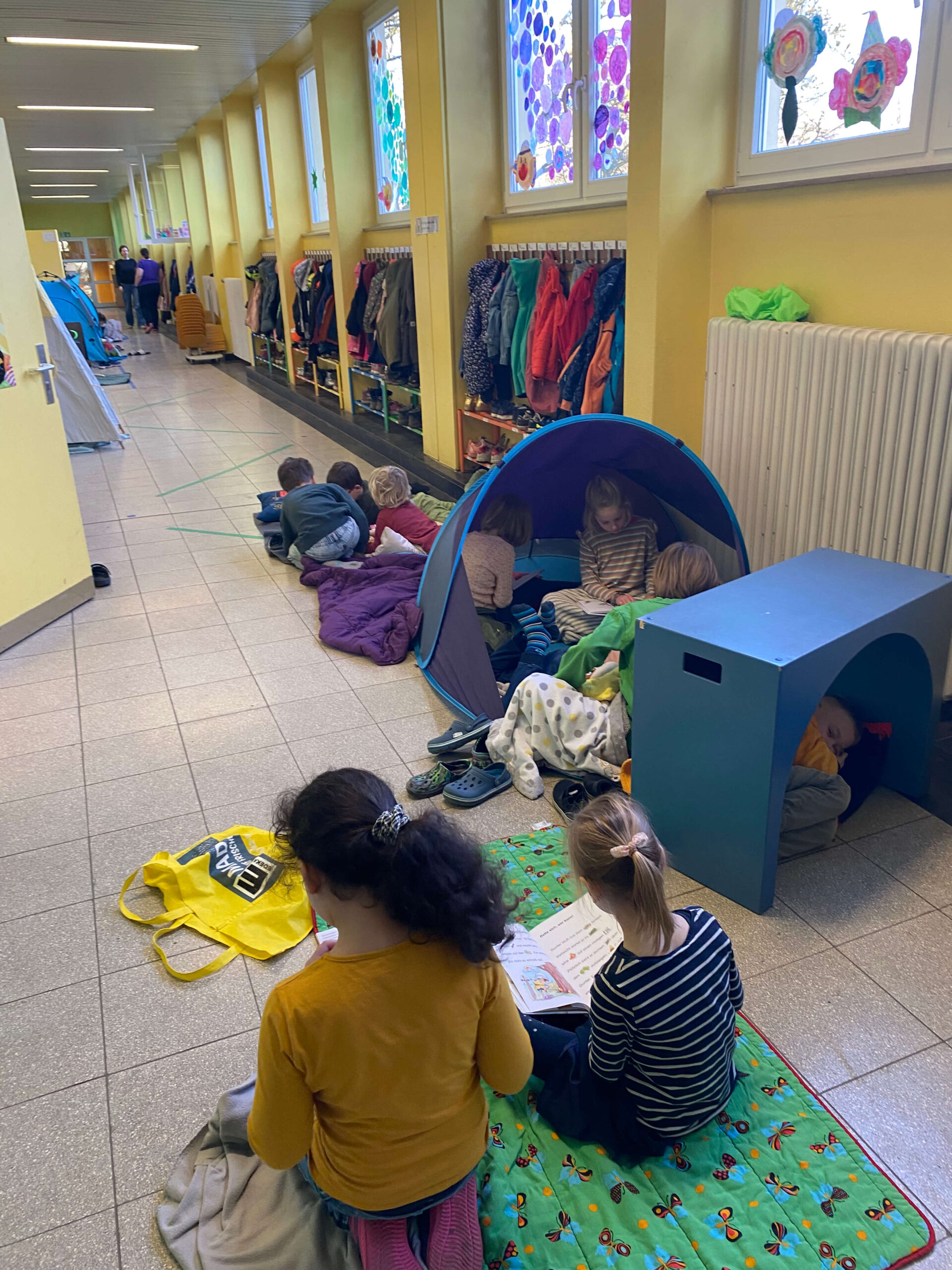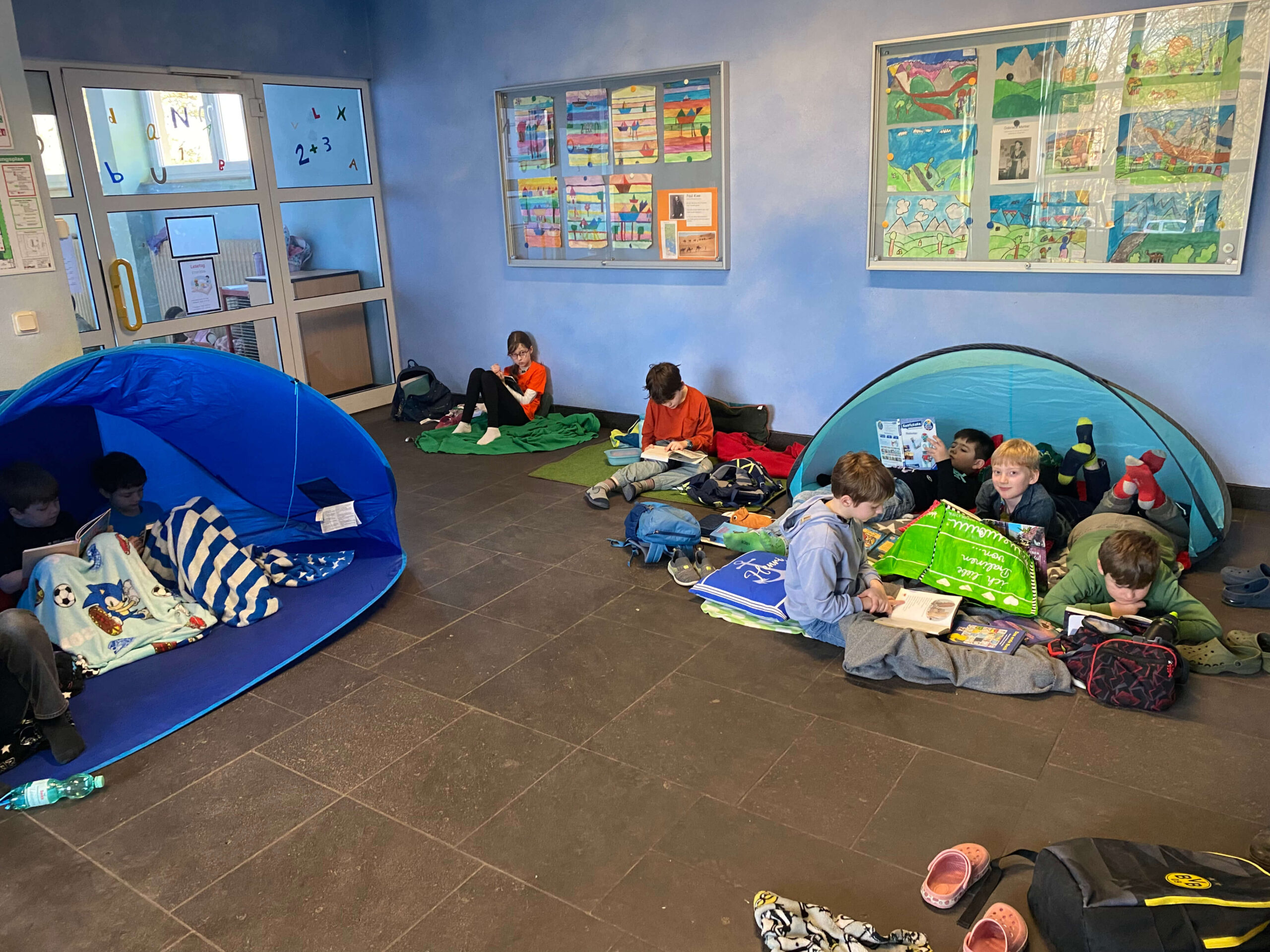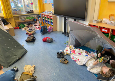 Schon vor Unterrichtsbeginn kamen die Kinder gemeinsam mit ihren Eltern und jeder Menge Gepäck in die Schule. Mit kleinen Zelten, Strandmuscheln, Decken, Kissen, Kuscheltieren und natürlich vielen spannenden Büchern richteten sie sich gemütliche Leseplätze ein – auf den Fluren und in den Klassenräumen entstand so eine ganz besondere Atmosphäre.
