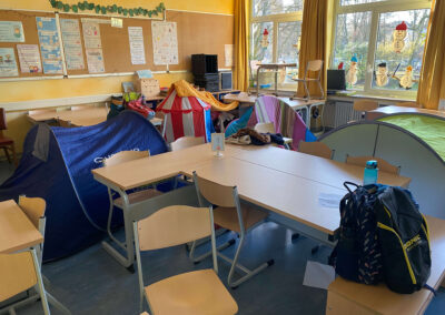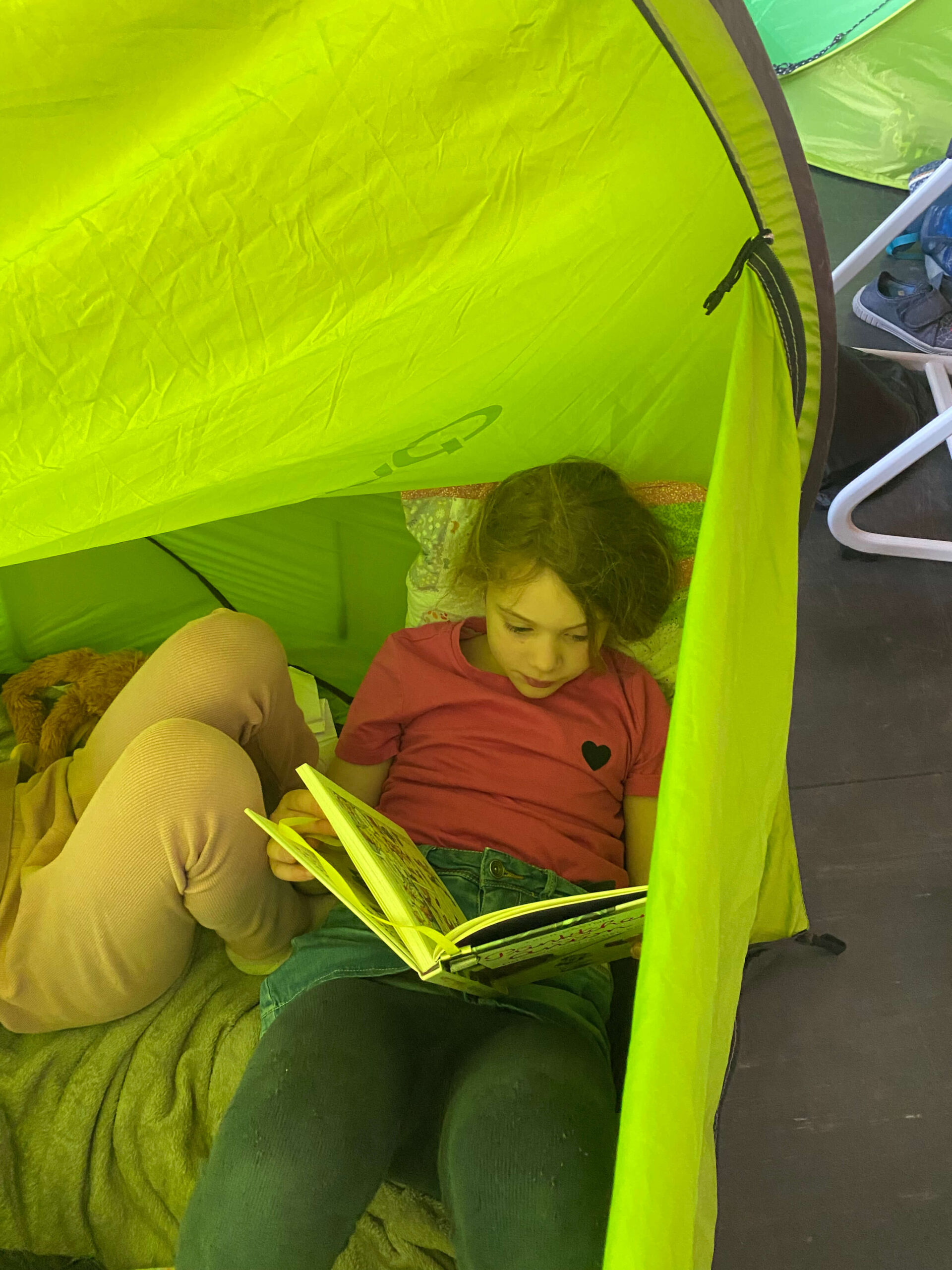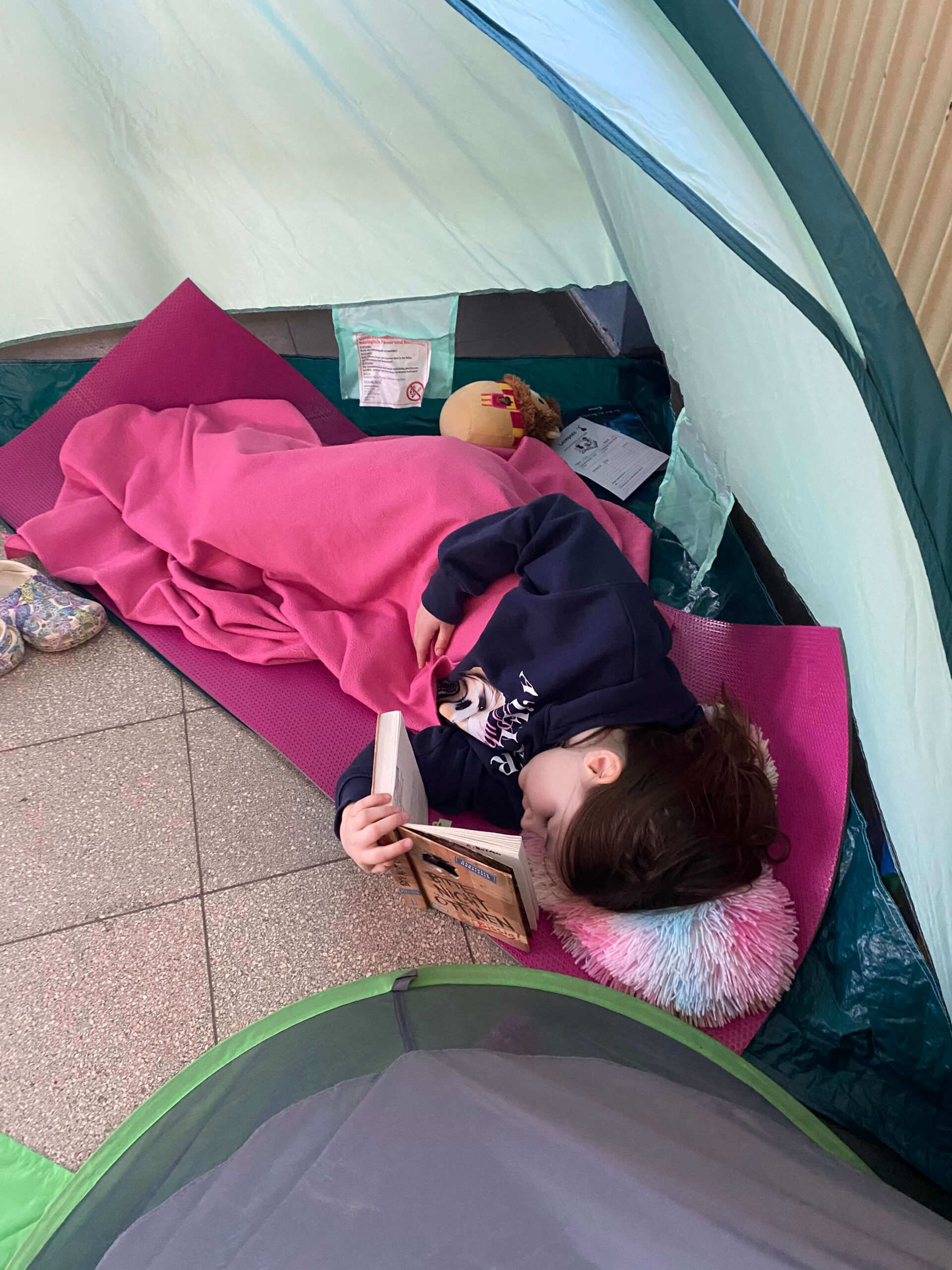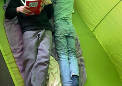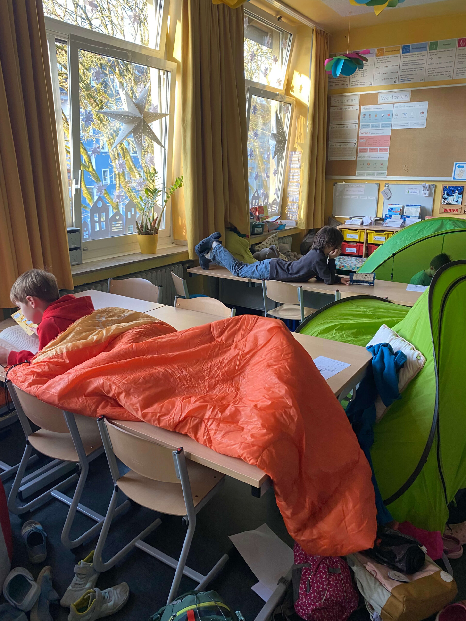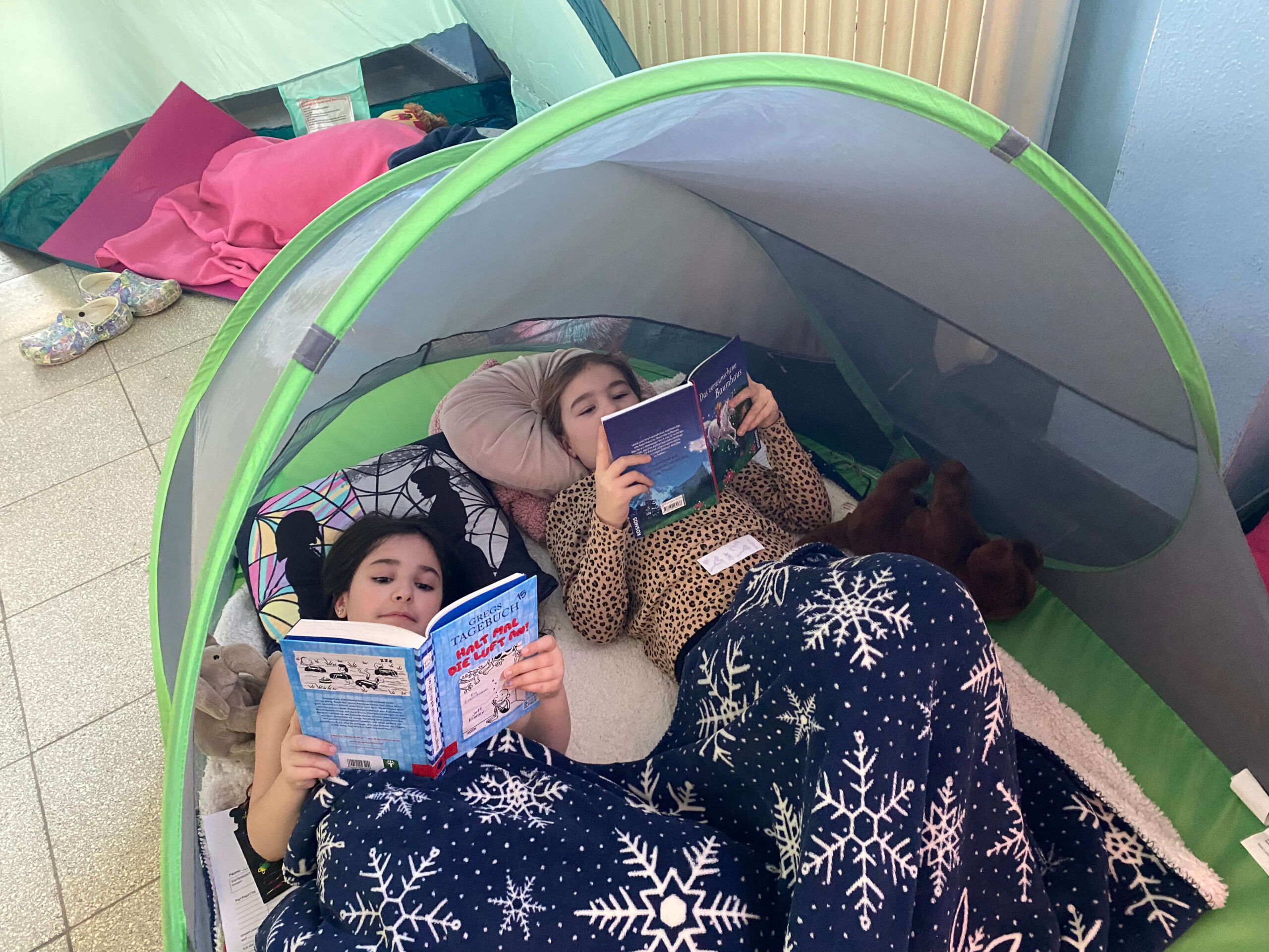 Schon vor Unterrichtsbeginn kamen die Kinder gemeinsam mit ihren Eltern und jeder Menge Gepäck in die Schule. Mit kleinen Zelten, Strandmuscheln, Decken, Kissen, Kuscheltieren und natürlich vielen spannenden Büchern richteten sie sich gemütliche Leseplätze ein – auf den Fluren und in den Klassenräumen entstand so eine ganz besondere Atmosphäre.