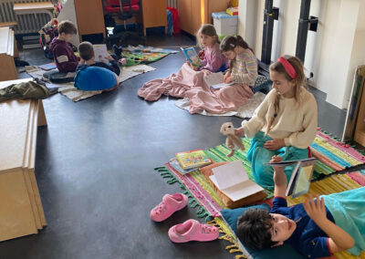 In dieser wunderbaren Umgebung hatten die Kinder viel Zeit zum Selberlesen, Schmökern und Entdecken. Zudem gab es zwei Vorlesezeiten, in denen die Lehrerinnen und Erzieherinnen aus ausgewählten Büchern vorlasen. Dafür hatten sie bereits am Mittwoch zuvor Plakate mit Bildern und Inhaltsangaben an die Raumtüren gehängt. So stieg die Vorfreude von Tag zu Tag – und den Kindern blieb die schwierige Wahl, bei welchen Geschichten sie zuhören wollten.