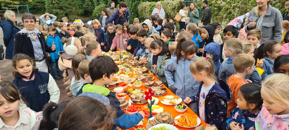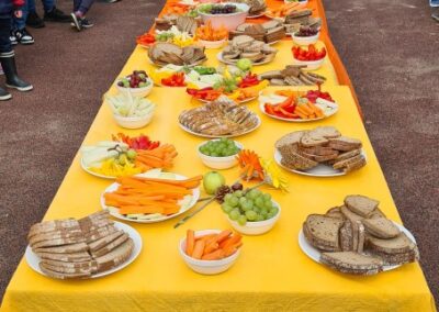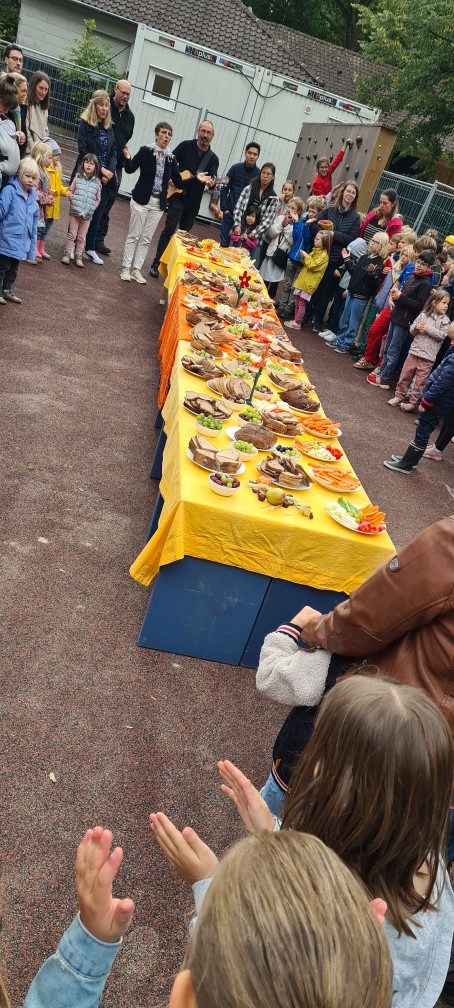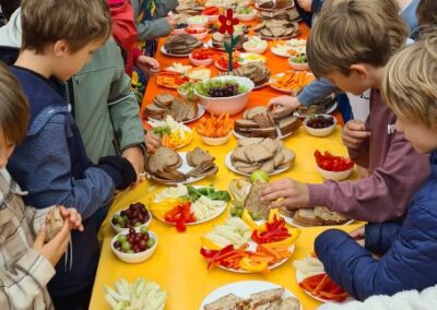 Anschließend lud eine lange, bunt gedeckte Tafel zum gemeinsamen Frühstück ein. Eltern unserer Schule hatten eine vielfältige Auswahl an Rohkost, frischem Obst und Brot vorbereitet, sodass sich Kinder, Eltern und das gesamte Schulteam stärken und miteinander ins Gespräch kommen konnten.